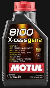 Масло моторное MOTUL 8100 X-cess GEN2 5w40 Высокотехнологичное 100% синтетическое моторное масло, специально разработано для современных бензиновых и дизельных двигателей легковых автомобилей, обладающих большой мощностью и объемом, т.ч. оснащенных турбонаддувом и непосредственным впрыском. MOTUL 8100 X-cess gen2 5W-40 имеет одобрения автопроизводителей, что позволяет применять его и в гарантийный период обслуживания. Предназначено для двигателей, работающих на любом типе топлива: бензин, дизельное топливо, сжиженный нефтяной газ (LPG), этанол, биодизель. Совместимо с каталитическими конверторами.